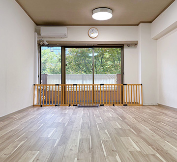 栄の真ん中にいながら、お部屋からの景色は緑が生い茂っております。日当たりも抜群バルコニーで夏場は水遊びも行っています。※ご要望に合わせて保育室を分けることも可。